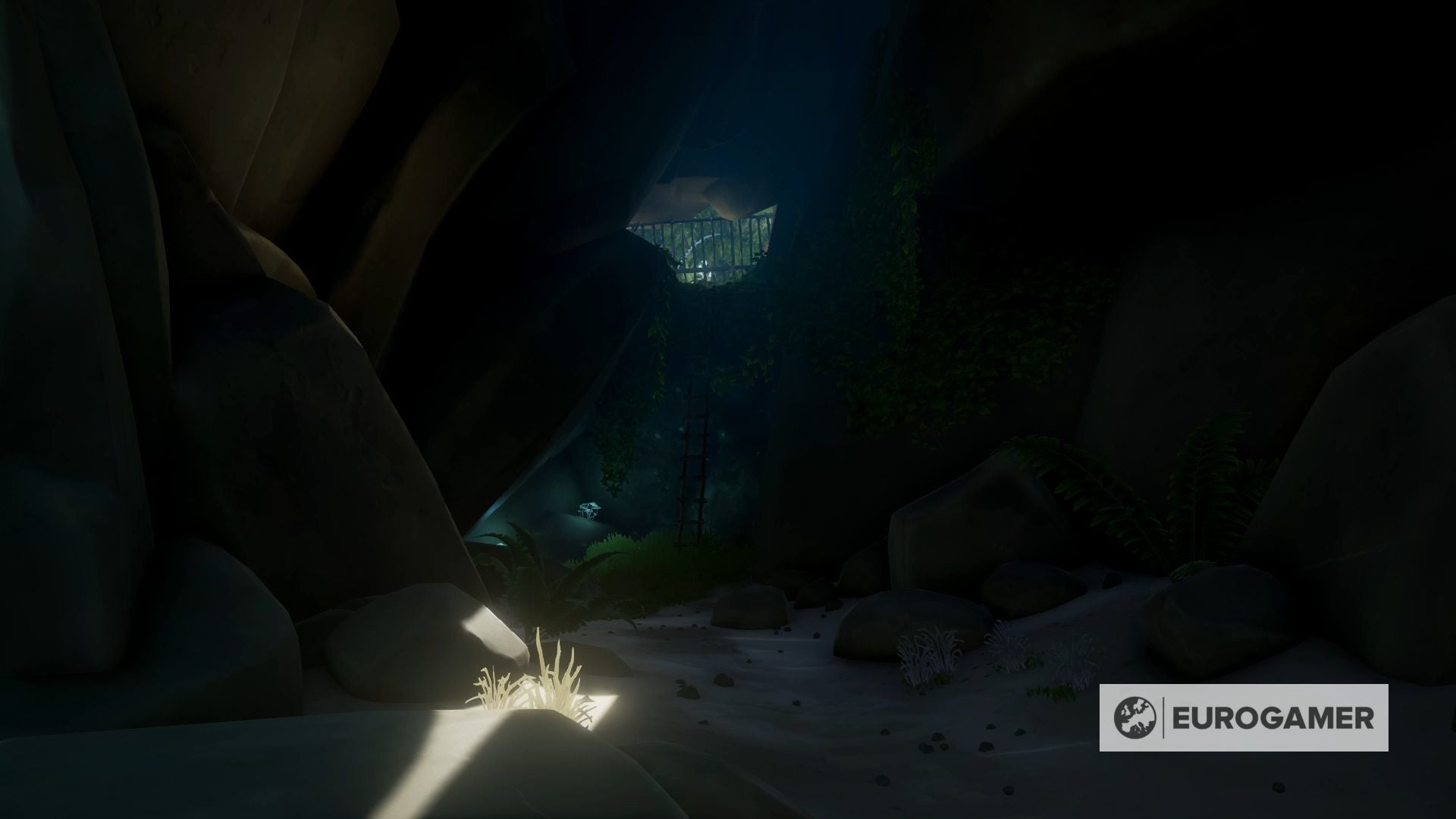 This volition bring you into a cave containing the rowing boat used for the Yer Boat commendation. Rather than climbing into the boat, head to your left where you'll see a ladder leading to a small ledge.