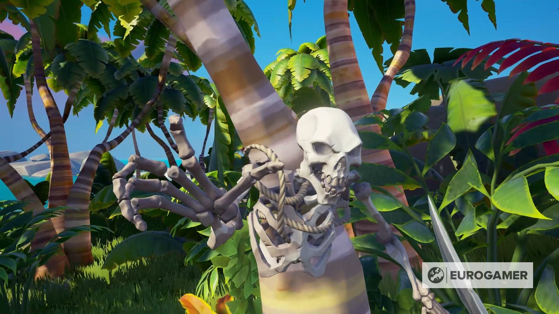 He'll instruct you to retrieve the cutlass that is sticking out of the remains of a skeleton tied to a nearby tree. When you do remember this cutlass, the skeleton won't exist likewise happy, and then quickly destroy information technology with a few swipes of your bract.